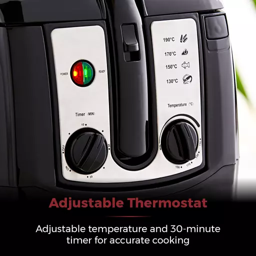 | Oil capacity of 3.0ltrs | Adjustable thermostat for accurate cooking |