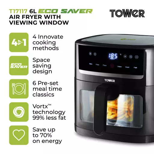 Take the fuss out of cooking with the 6L Vortx  Eco Saver Air Fryer from Tower. The compact design ensures easy storage whilst still giving the flexibility to cook large, healthy meals with ease.Â