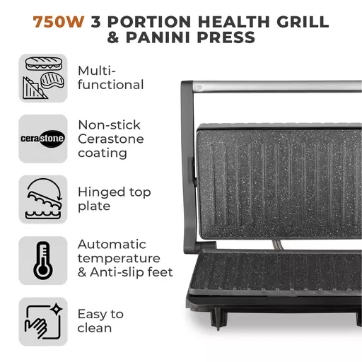 | 750W Panini grill | Little or no oil needed for healthier cooking |