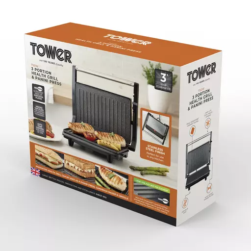 Grill delicious meats, press deep-filled paninis, toast ciabatta and more with Tower’s 750W 3 Portion Health Grill and Panini Press. Its 1600W power provides fast and efficient cooking, heating up in approximately 3 minutes. Featuring double-sided Cerastone non-stick coated plates, the grill requires little to no oil, for easy cleaning and healthier cooking. The ultra-fast, double sided non-stick Cerastone coated ridge plates are easy to clean, and provide fast grilling on both sides with little to no oil needed. The elevated ridges help to guide fat away from food for healthier oil free cooking.