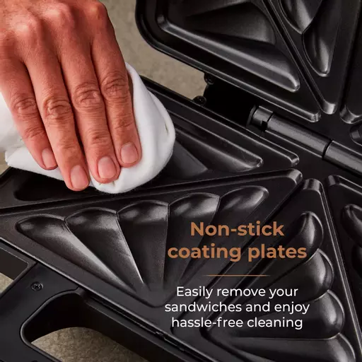 | 900W Deep Fill Sandwich maker. | Non stick coating plates for easy cleaning. |