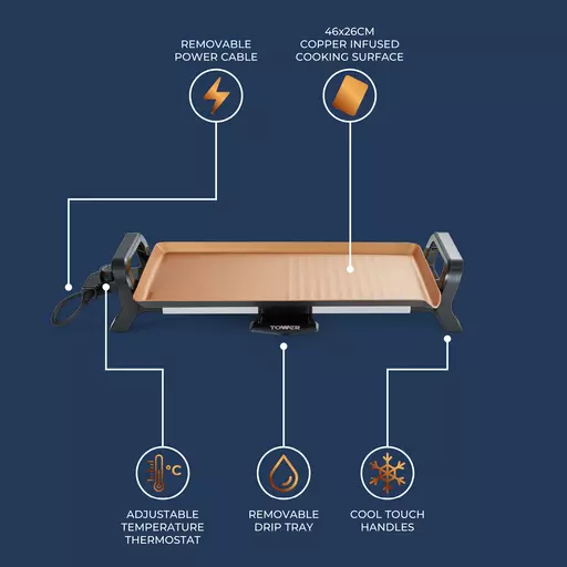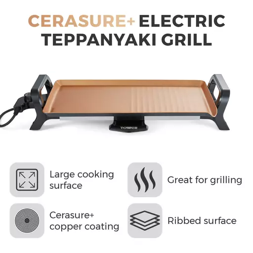 |  LARGE 46CM X 26CM COOKING SPACE A large cooking surface lets you grill more ingredients in one go, suitable for serving up to 6 portions of delicious food to family and friends at the same time  CERASURE+ COATING The grill plate features a Cerasure+ ceramic non-stick surface which requires no oil for healthier cooking and is easy to wipe clean after use  GREAT FOR GRILLING This powerful 1800W grill uses an adjustable thermostat with maximum temperatures up to 220 degrees C for fast, precise grilling of meat, vegetables, fish and fried dishes. The open cooktop design allows you to cook in front of your guests and get them involved with the grilling to create an entertaining experience  RIBBED SURFACE Designed with deep ridges to allow your food to breathe, locking in extra tasty flavour and juices from meat. Provides even heat distribution for a perfectly cooked meal and helps guide any excess fat and grease from food into the oil drip tray  PART OF THE CERASURE+ COLLECTION Essential kitchenware constructed using a quality ceramic copper coating  3 YEAR GUARANTEE Trusted Tower quality with a standard 1 year guarantee and 2 year extension, subject to product registration online  |