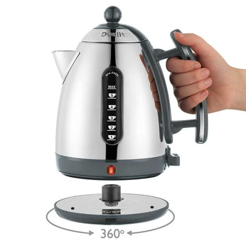 The Dualit Lite Jug Kettle Grey sits on a 360 degree axis base which also has a useful cord storage.