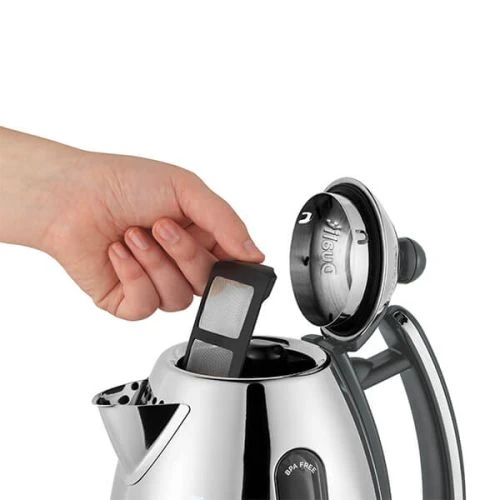 The limescale filter is removable and washable and the hinged easy-fill lid has a large, heatproof knob and finger guard to keep your hands clear from the body of the kettle once boiled.