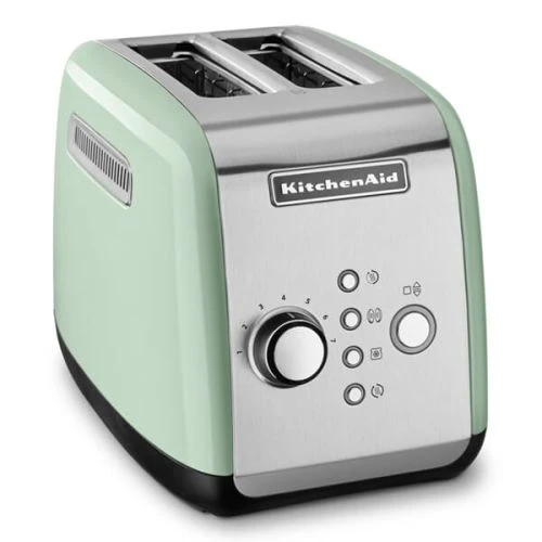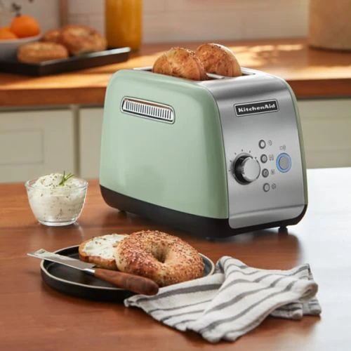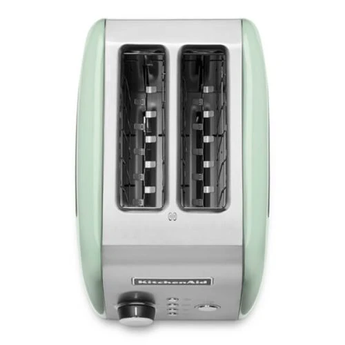 The compact KitchenAid 2 Slot Toaster finished in Pistachio has a sturdy all-metal body construction with a chrome control knob. This automatic toaster smoothly lowers and lifts the toast for you and gives an audible alert when the toast is ready.