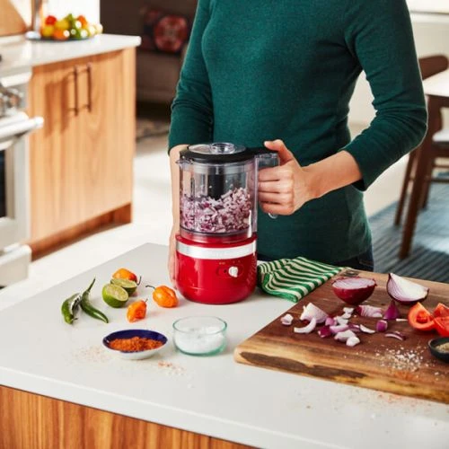 Unplug and unleash your creativity in the kitchen with the KitchenAid Empire Red Cordless Food Chopper, no cord results in a clutter free countertop!