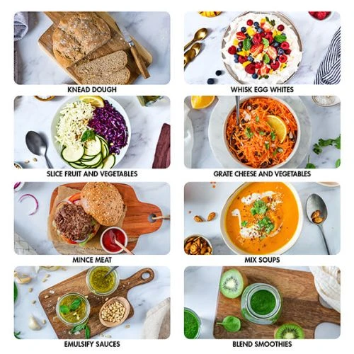 ACCESSORIES INCLUDED – Extra-large feed tube, triple pusher, stainless steel blade, BlenderMix, dough blade, egg whisk, 2mm slicing / grating disc, 4mm slicing / grating disc, spatula, storage box, Recipe book, Citrus Press.