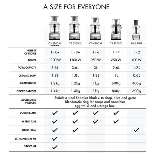 5200XL CAPACITIES – Bread dough – 1.2kg; Pastry – 1.5kg; Blending – 1.8L; Chopping (meat) – 1.4kg; Grating (carrots) – 1.4kg; Egg whites: 8.