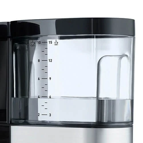 A detachable clear water tank is easy to fill and features clear cup markers for accurate filling.