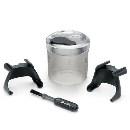 Includes: 2 Porta-filter cradles suitable for 50-54mm filters and 58mm commercial filters, air tight grinds container, cleaning brush.
