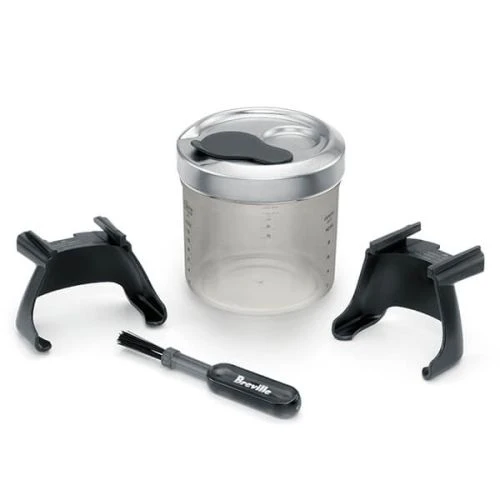 Includes: 2 Porta-filter cradles suitable for 50-54mm filters and 58mm commercial filters, air tight grinds container, cleaning brush.