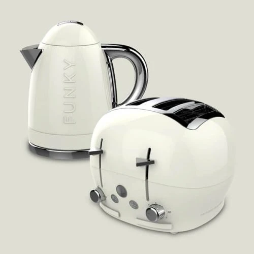 This Funky Appliance kettle and toaster set from the Funky Appliance Company features the Funky Appliance 1.7L Kettle (FK01CREAM) and the Funky Appliance 4 Slice Toaster (FT01CREAM), both finished in fabulous Cream.