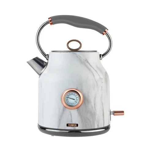 This stylish kettle features a sleek marble effect finish with rose gold accents which will suit and contemporary or modern kitchen. A large handle provides a firm grip and allows full control when pouring. The kettle is completed with a temperature dial on the front.
