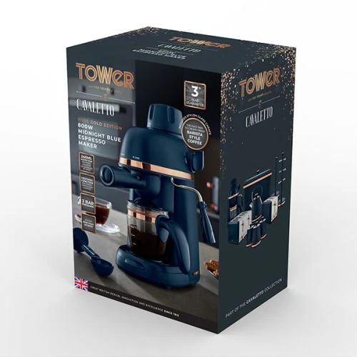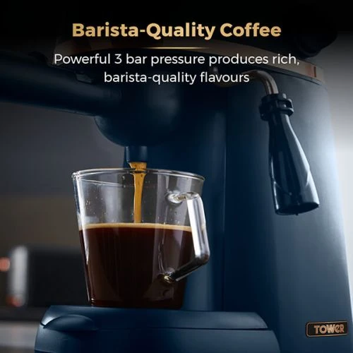 The Tower Cavaletto midnight blue espresso machine features a 3.5 bar pressure for producing a rich tasting barista quality coffee at home in just minutes.