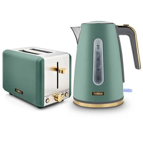 The Tower Cavaletto jade set contains a 1.7 litre jug kettle and a 2 slice stainless steel toaster.