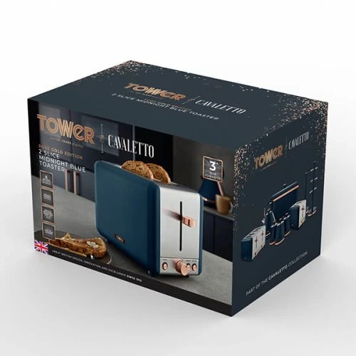 The Tower Cavaletto midnight blue 2 slice stainless steel toaster has a contemporary matt midnight blue finish with elegant rose gold accents adding style to your kitchen and fits in with the coordinating Cavaletto range (sold seperately).
