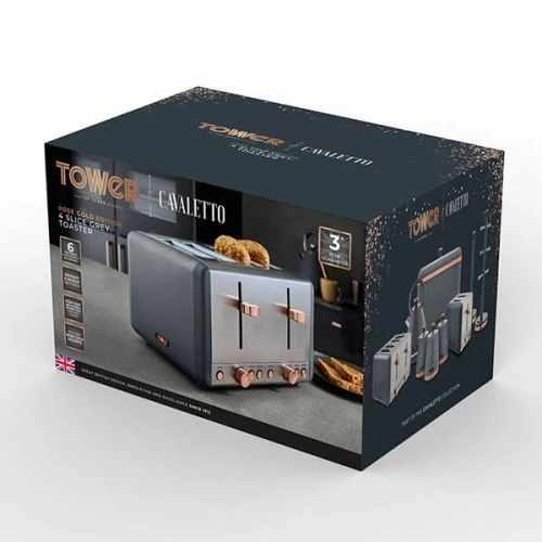 The Tower Cavaletto grey 4 slice stainless steel toaster has a contemporary matt grey finish with elegant rose gold accents adding style to your kitchen and fits in with the coordinating Cavaletto range (sold seperately).