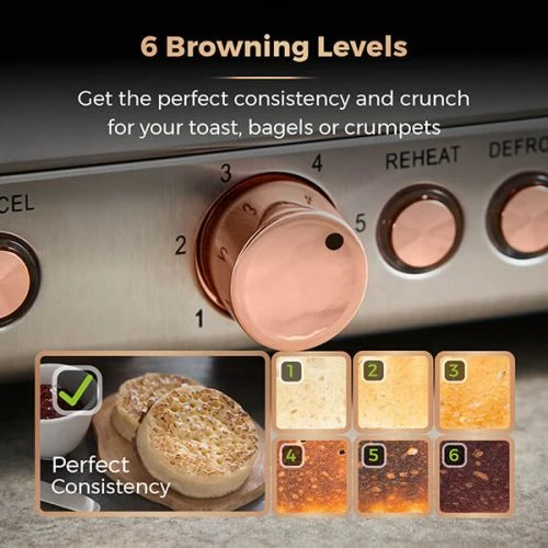 The 4 slice toaster has 6 browning levels and also features a defrost setting for bread straight from the freezer, plus a reheat setting in case your toast has gone cold or other baked items that need warming.
