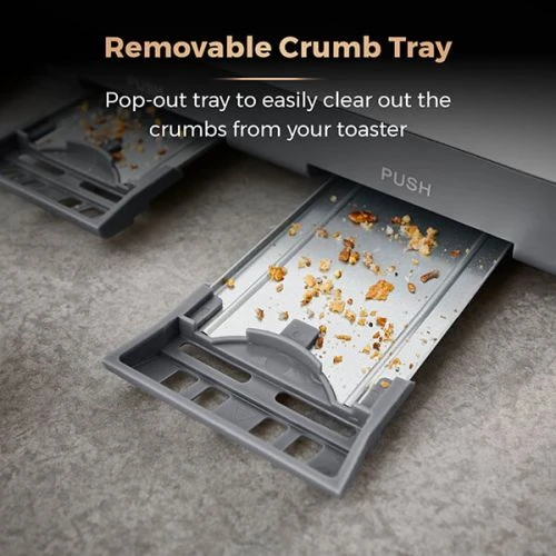 The removable crumb tray of the 4 slice toaster makes it easy to keep the toaster well maintained and free of crumbs. The toaster includes convenient cord storage for keeping your countertop clear of trailing wires.