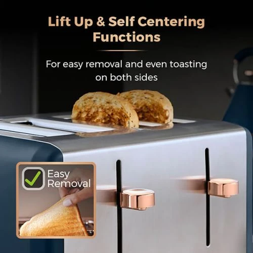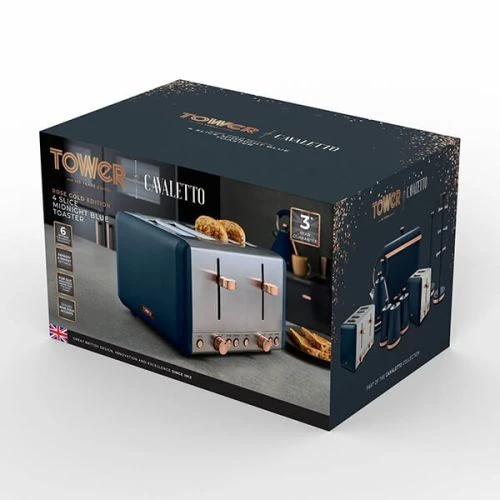 The Tower Cavaletto midnight blue 4 slice stainless steel toaster has a contemporary matt midnight blue finish with elegant rose gold accents adding style to your kitchen and fits in with the coordinating Cavaletto range (sold seperately).