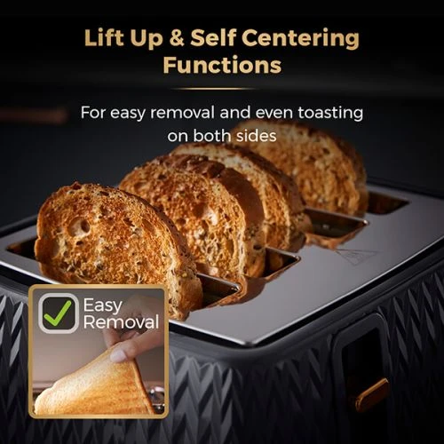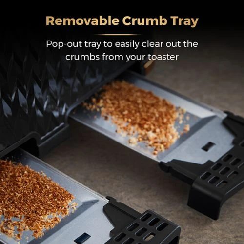 The removable crumb tray of the 4 slice toaster makes it easy to keep the toaster well maintained and free of crumbs and has an automatic turn off function and anti-jam function.