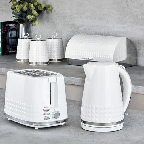 The Tower Solitaire white kettle and toaster set includes a 3KW 1.5 Litre Kettle in white features a stylish design with a high gloss body and a stainless steel trim.