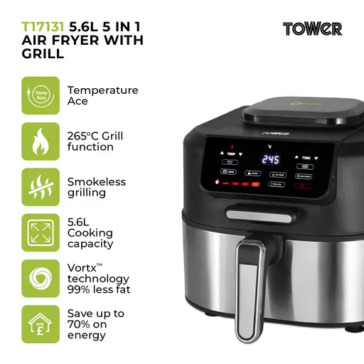 Fry, roast, grill or bake your way to deliciously healthy meals with the Tower Vortx 5.6L Air Fryer and Grill with Crisper. Utilising Vortx technology, the hot air rapidly circulates evenly ensuring your ingredients are cooked thoroughly with a crispy texture. Little to no oil is required, all while keeping the same great taste, so you lose the fat not the flavour. By switching to your air fryer, you can slash your energy by 70% energy as it uses less power than a conventional oven. Packed with a powerful punch it cooks food 30% faster than a conventional oven, with 500g of fries ready to eat in under 20 minutes. Hotter than most conventional ovens, the heat soars up to a sizzling 265°C and circulates around your food to expertly chargrill succulent steaks and crisp off breaded chicken. Use the Digital Control Panel to set the time or choose from six cooking functions including grill, bake, roast, air-fry, crisp & dehydrate. Effortlessly achieve the perfectly cooked steak with the Temperature Ace feature. The air fryer monitors the internal temperature and cooks steak just to your taste, from a juicy medium-rare to a deliciously charred well done. Bring deliciously chargrilled food indoors without the fumes using smokeless grilling. Ideal for a rainy summer’s day when you can’t get the barbecue out.