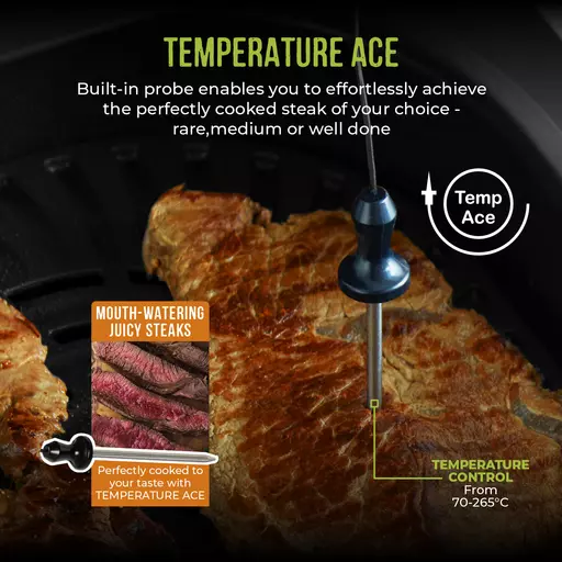 Built-in probe enables you to effortlessly achieve the perfectly cooked steak. The air fryer monitors the internal temperature and cooks steak just to your taste, from a juicy medium-rare to a deliciously charred well done