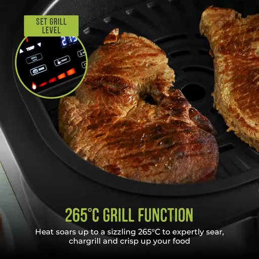 Hotter than most conventional ovens, the heat soars up to a sizzling 265°C and circulates around your food to expertly sear succulent steaks and crisp off breaded chicken. Enjoy delicious chargrilled food indoor without the fumes