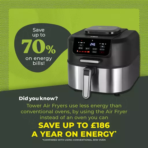 Cooking food 30% faster, Tower Air Fryer use less power than conventional ovens. Save on up to 70% on your energy by simply switching to Air Fryer cooking with savings of £224 per year