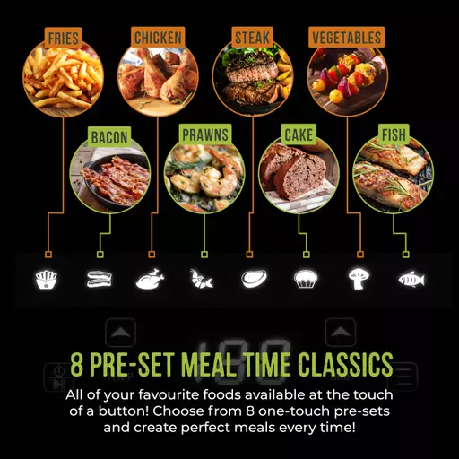| Pre-sets: Fries. Bacon. Drumsticks. Prawns. Steak. Cake. Veg. Fish | Temp range 80-200 degrees. 60 Minute timer |