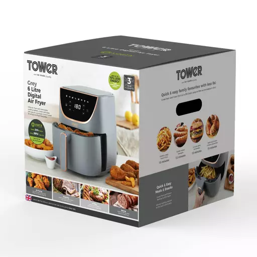 Make family cooking simple with this 6L Digital Air Fryer from Tower. Vortx technology rapidly circulates hot air around the chamber to cook food 30% faster with only a little oil required, perfect for healthy, yet beautifully crisp meals. Enjoy meals with 99% less fat so you get all the great taste with great health benefits. Air Fryers cook faster than a conventional oven and you could save up to 70% on your energy bills by swapping to air fryer cooking. The digital touch panel allows you to set the temperature & timer at the touch of a button, with 8 menu pre-sets are designed to bring more variety to meal times. The removable drawer and crisper grill tray both come with a non-stick coating for greater food release and simple cleaning. A 90cm power cord offers the freedom to move anywhere across the work top, whilst a generous 6L basket ensures food can be cooked for the whole family with ease. A cool touch handle ensures improved safety, reducing the chance of burns when opening the fryer.Â
