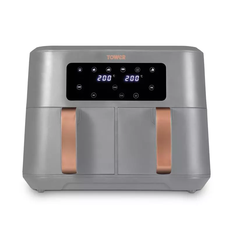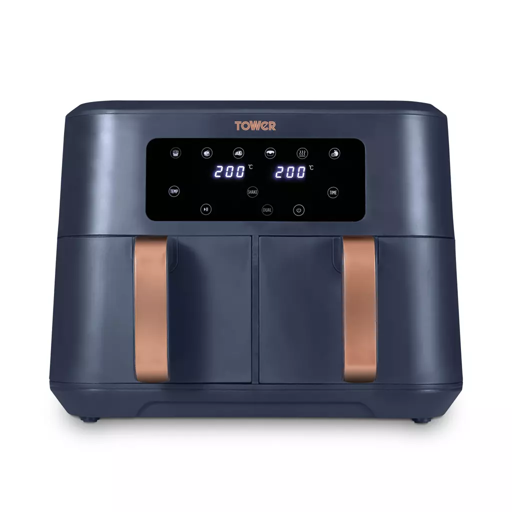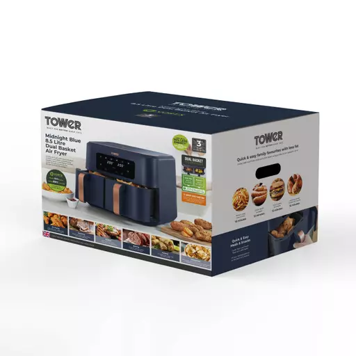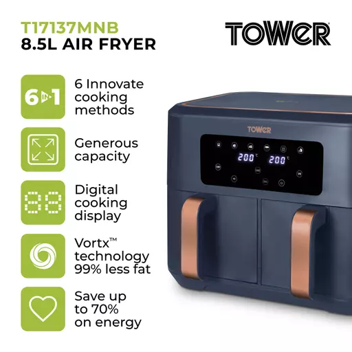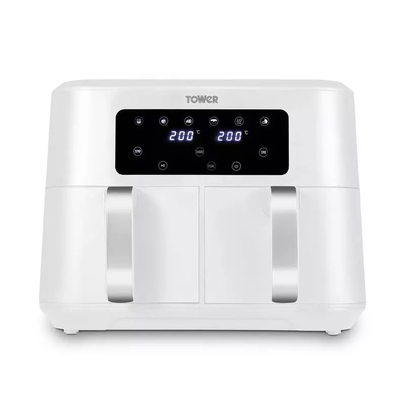 Exclusive to Tower Air Fryers, Vortx technology rapidly circulates hot air around food. Cooking up to 30% faster than a conventional oven and using 99% less oil, allowing you to save up to 70% on your energy. The Dual Basket Air Fryer boasts two baskets to provide the ultimate in air frying versatility, giving you the freedom to cook single portions or larger portions, as required. You can cook separate meals simultaneously in the two 4.25L compartments with a combined capacity of 8.5L, enough to feed up to 10 people at once. The Sync Finish function will control cook times, so that both baskets finish cooking at the same time. No more juggling multiple cooking times for easy meal preparation. You can also choose from 6 preset options so you can cook crispy fries, moist chicken, succulent steaks or bake delicious cakes. It Is also possible to reheat and dehydrate food with your air fryer through the digital touch panel. Non-stick coatings on the baskets ensure an easy clean up, whilst cool touch handles will protect you from burnt fingers.