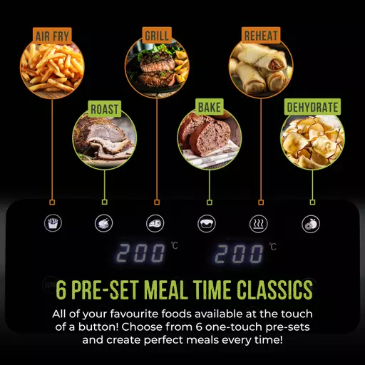All of your favourite foods available at the touch of a button! Choose from 6 one-touch pre-sets to take the guess work out of cooking including fries, chicken, steak, bake and reheat. The Dual Basket Air Fryer can even dehydrate food for longer life whilst storing taste and nutrients. Create perfect meals every time!