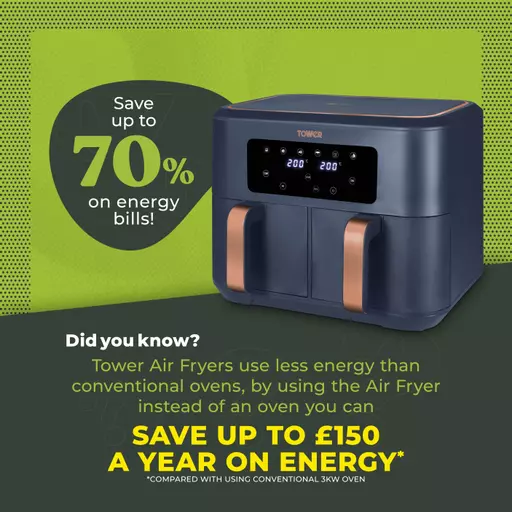 Tower Air Fryers are powerful and cook food much faster than conventional ovens, yet they also use far less energy. Save up to 70% on your energy by simply switching to a Tower Air Fryer cooking which could reduce your energy bills by £163 per year