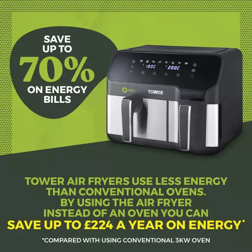 Tower Air Fryers are powerful and cook food much faster than conventional ovens, yet they also use far less energy.  Save up to 50% on your energy by simply switching to Tower Air Fryer cooking, which could reduce your energy bills by £210 per year